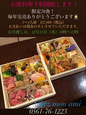 ご予約お待ち致しております! - - - - - - - - - - - - - - - - - - - - - - - - - - - - - - - - - - - - - - - - - - 〜 お節料理予約開始のご案内 〜 毎年ご好評いただいております 「フランス風お節料理」の予約受付を開始致しました! ★フランス風お節料理★ 黒毛和牛、フォアグラ、オマール海老など 高級かつ安全な食材を使用した豪華二段重。 お子様からご年配の方々まで 大好評のフランス風お節料理です。 是非ご賞味ください! 3〜4人前 要予約、限定70食 毎年完売です! ご予約はお急ぎください! ¥27,000(税込) ※お支払いは現金のみとさせていただきます。 お引き渡し日時:12/31(水)10時〜12時
