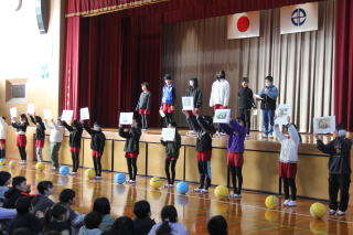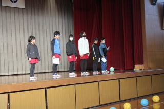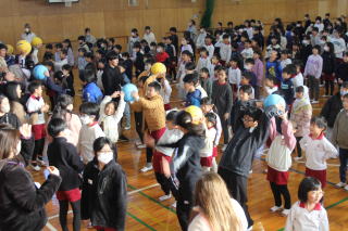 | 1月14日水曜日 ふれあいコミュトレ 今日の朝は、全校でのふれあいコミュトレ。いつもは、クラスで行うコミュトレを今回は、全校児童が体育館に集まり、実施しました。内容は「認め合いボール渡し名前シャワー」です。ボールを渡す際に、名前を呼びながら「~~が好きな〇〇さん」など、その人が好きなものを付け加えて、相手にボールを渡します。受け取った人は、笑顔で「ありがとう!」と伝えて、次の相手に渡していくというレクリエーションです。先生も列の一員となって、みんなで楽しむことができました。 |