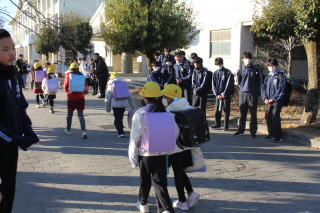 | 2月24日火曜日 通学団会&大縄跳び8の字チャレンジ 今日の2時間目は、通学団会です。それぞれの通学団の場所へ集まり、来年度のことを話し合いました。ここでは、来年度の班長さん、副班長さんや並び順などを決めました。また、新1年生への案内状を作り、近くの子がもっていきます。いよいよ来年度のことが少しずつ決まっていきますね。 また、先週に引き続き、大縄跳びの8の字チャレンジがありました。みんな新記録目指して、クラスで協力し合って取り組んでいました。 |
