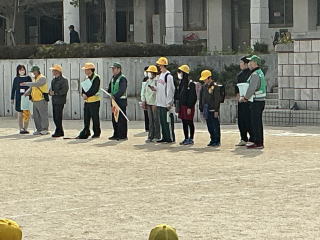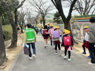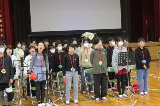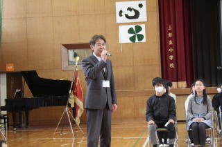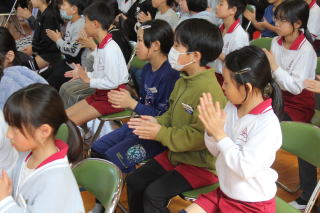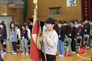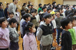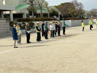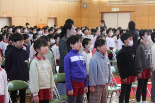 | 3月2日月曜日 登下校の見守りに感謝する会 昨年から始まった「登下校の見守りに感謝する会」。昨年は、あいにくの雨で、室内での開催でしたが、今年は晴天で、運動場で実施することができました。毎日、登下校を見守っている地域のボランティアの方々のおかげで、子どもたちが安心して登下校をすることができています。地域の皆様に感謝です。 |