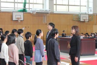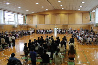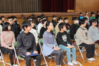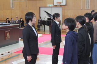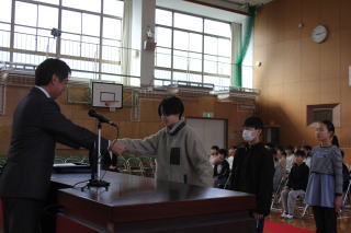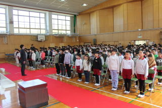 | 3月13日金曜日 卒業式 予行練習 今日は、卒業式の予行練習です。予行練習の前に、精勤賞などの表彰がありました。表彰の後は、いよいよ卒業式の予行練習。卒業生は、これまでの練習の成果を在校生に示すときです。6年生は、卒業式で成長した姿を見せるため、年明けから意識しながら学校生活を送ってきました。在校生は、その姿を見て、気が引き締まりました。在校生も卒業生も精一杯頑張った予行練習でした。 |