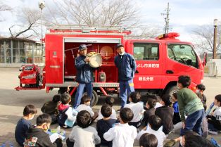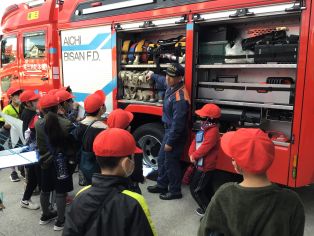 | 校外学習 3年生が、社会科「火事からくらしを守る」の学習のため、尾三消防本部へ見学に行きました。見学中、実際に出動する場面がありました。指令から出動まで2分以内という様子を見たり、防火服を着たりするなど、貴重な体験から消防署のひみつをたくさん学ぶことができました。 |