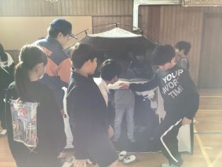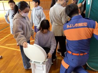 | 防災教育出前講座 4年生が、小学校施設内にある防災備蓄品を活用した避難所生活体験を実施しました。実際に避難ルームに入ってみたり、仮設トイレを組み立ててみたりするなど、見て触って感じることができました。ご家庭でも、災害時の備えについて話題にしていただけたらと思います。 |