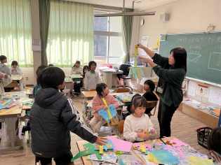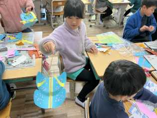 図画工作科では、「どんなうごきにみえるかな」をテーマに、紙を折ったり、切ったりすることで、思い思いのものをつくっていました。同じ材料を使っているのに、蛇や恐竜のような強い生き物からひらひらと華麗に舞うチョウなど、世界に一つだけの作品ができ上がっていくのが不思議です。