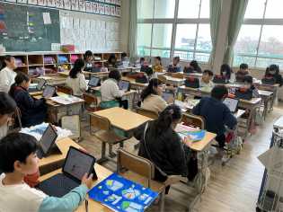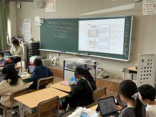 教室では、図工の授業で鑑賞会をしていました。 自分の作品と作品づくりで、がんばったところをタブレット上で全員で共有するなどICT機器を使用していなかった時代からすると夢のような鑑賞会になっていました。