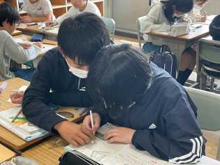 話し合ったり、教え合ったりしながら集中して学習にも取り組んでいます。さすがは最高学年! |