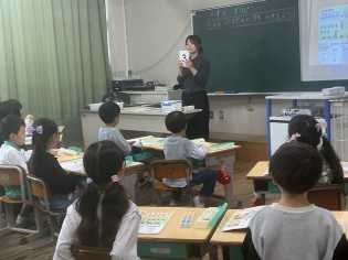 学校生活の勉強をしている1年生。6年生のお助け隊に手伝ってもらってもらいながら、素早く朝の支度を済ませた1年生は、大好きな6年生の誘いもあって、全員が運動場に出て、朝から元気に遊んでいます。金曜日でも、疲れ知らずの1年生には驚かされます。 |