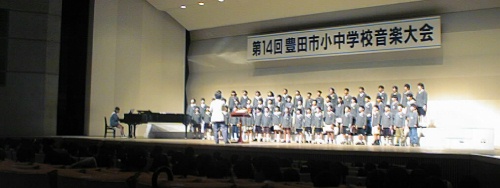 14回豊田市小中学校音楽大会」が開かれました。年々人数が減ってきているため、本校では今年から4年生も参加することになり、したため、総勢57名での演奏となりました。4年生が入ることで高いレベルを維持できるかと心配されたために合唱部の練習も例年以上に力がこもっていました。当日は、「歌はぼくらの友だち」(アップテンポの曲)「歌よありがとう」(しっとりと聞かせる曲)の2曲を歌いました。ゆりかさん、有紀さんのピアノ演奏も、多くの人々が見守る中、最後まで立派に弾き終えることができました。「とても緊張した」「よその先生に『1番うまかったよ』ってほめられちゃった」と2人は、演奏が終わってから教えてくれました。きっと他の子も同じような感想を持ったに違いありません。何にもまして、52人が気持ちを一つにして、ハーモニーを大切にしたことがすばらしいと思います。大変よくがんばりました。審査の先生のコメント