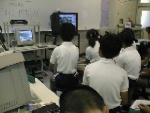 7月14日(火)テレビ会議システムを使って北小学校と結び,遠隔(えんかく)授業が始まりました。