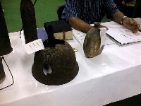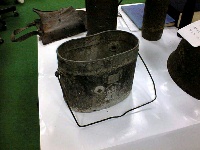 大砲の弾の薬きょう(やっきょう)・兵士のはんごう・穴の開いた鉄かぶと・兵士の水筒