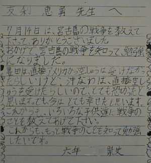 - 友利先生、お元気ですか。宮古島での戦争のことをいろいろ教えてくださってありがとうございました。また、ぼくたちも学校で調べたことをインターネットで送り、意見を交換したいです。またよろしくお願いします。お元気でいてください。(宏昭)