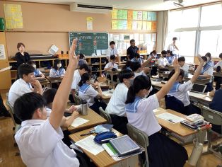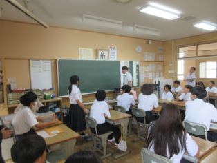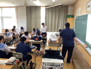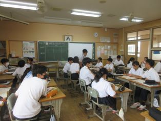 3年生の学級では、社会科の授業で、実際の裁判から権利について学びました。どの生徒も自分の考えをもち、真剣に話し合う姿が見られました。2年生の学級では、愛知教育大学から学校体験活動として、7日間の実習をスタートさせました。2年生の生徒とも良好な関係を築き、ともに学んでほしいと思います。 |