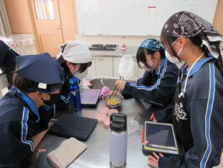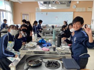 | 3年生と1年生の調理実習の様子です。3年生では、幼稚園実習を終えて、幼児が栄養を十分にとるためには、おやつを摂取する必要性を学んだことを生かして、「マカロニきなこ」を作ることに挑戦しました。栄養価も計算しながら、真剣に園児のことを考えている姿がとても印象的です。 |