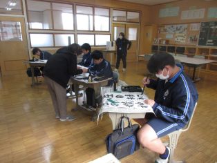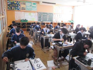 | 国語の授業では、1月の校内競書会に向けて、毛筆の練習を始めました。手本を見ながら集中して書く姿がどの学年でも見られます。 |