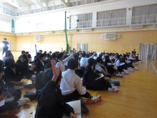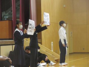 | 3時間目に冬休み前最後の集会を行いました。情報委員会からは「デジタル・シティズンシップ教育」について、人権委員会からは「LGBTQ」などの人権にかかわる内容について、クイズ形式にして、全校生徒に分かりやすく伝えました。校長先生からは、年末年始らしい「八百万の神」についての話がありました。日本らしい有意義な冬休みとなるよう、過ごしてもらえたらと思います。 |