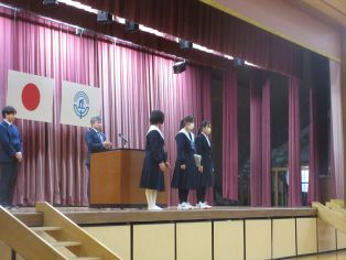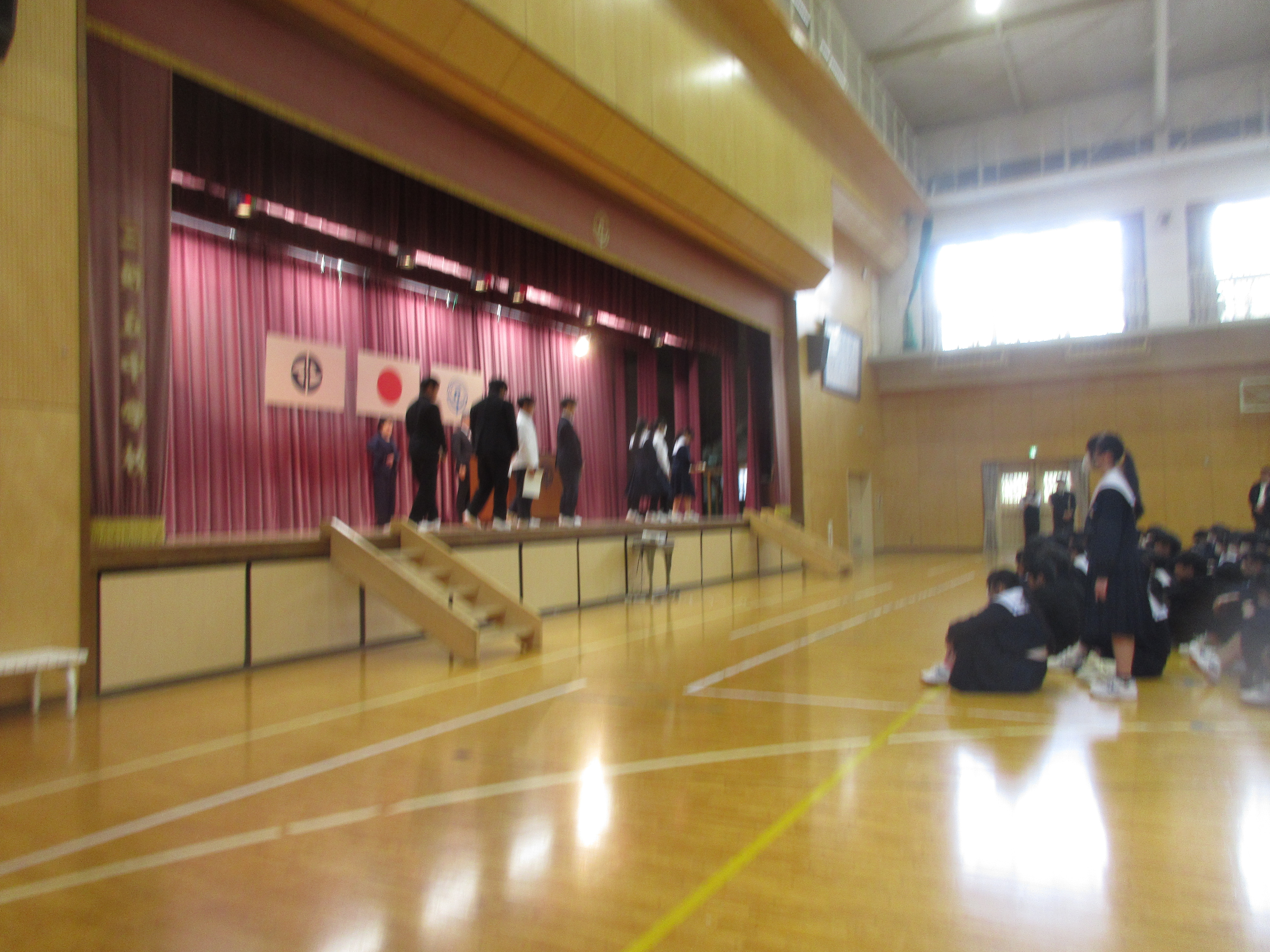 | 生徒たちの元気な声が三好丘中学校に帰ってきました。1時間目の集会では、校長先生から「目標を宣言することの大切さ」について話がありました。また、生活委員からは、正しいあいさつを校内に広めていこうということで、デモンストレーションを使った発表が行われました。3,4時間目には校内競書会も行われ、気持ち新たに新しい年に臨む姿勢が伺える一日となりました。これからの生徒の姿勢に期待したいと思います。 |