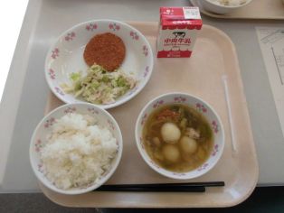 | 今日の献立 ・ご飯、肉じゃが ・牛乳、ココア牛乳の素 ・れんこんサンドフライ、元気サラダ 今日の献立は、緑丘小学校のリクエスト献立です。1年生の国語の授業で登場する「元気サラダ」は、みんなが興味をもって食べられるし、低学年でも牛乳が飲みやすいように「ココア牛乳の素」をつけた全校のみんなが食べやすいように考えられた献立です。 |
