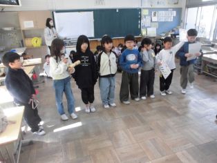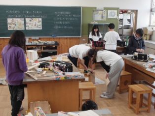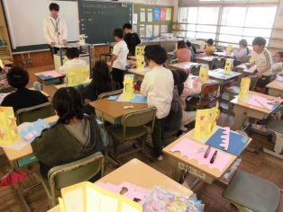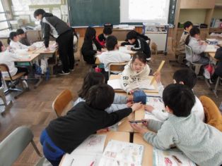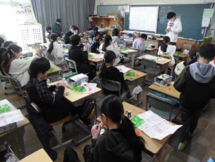 | 4年生 6年生を送る会の発表について確認しました。 図工 のこぎりで木を切って生活の中で使えるものを作ろう |
