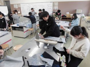 | 2月19日(木) 5年生 家庭科 エプロン作り すそとひもを通す所をぬおう 今日もたくさんのボランティアの方にお手伝いいただきました。 |