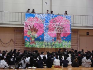 | 1年は6年生への感謝のメダル 2年生は会場を飾っている輪飾り 3年生は舞台上のかんばんと輪飾り 4年生は飾りに使われている花と花道のアーチ 5年生は体育館の飾りつけと空に羽ばたく106羽の鳥 をそれぞれ作成しました 全校でも作品を作り上げました |