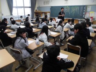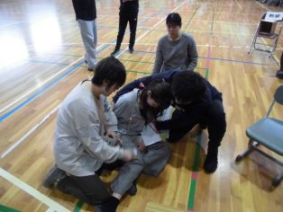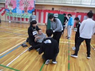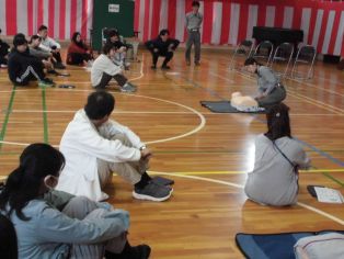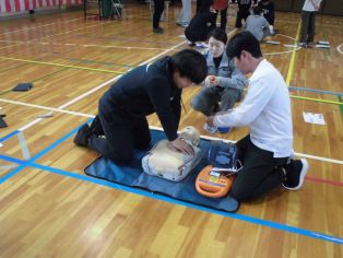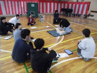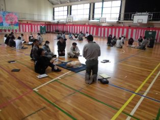 | 4月6日(月) 尾三消防署の方を招いて 救急救命法講習会を行いました。 最初に AED・心肺蘇生法について 繰り返し練習しました。 |