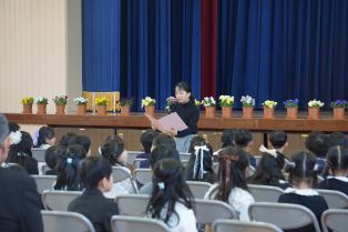 | 入学式・始業式 1年生は体育館、2~6年生は教室でリモート参加で行いました。 6年生代表児童が歓迎の言葉を述べました。 |