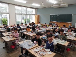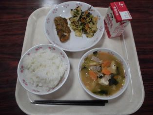 | 今日から給食が始まりました 今日の献立 ・ご飯、牛乳、豚汁 ・かれいの香味ソースかけ ・野菜のいそ香あえ 笑顔の給食時間になるといいです |