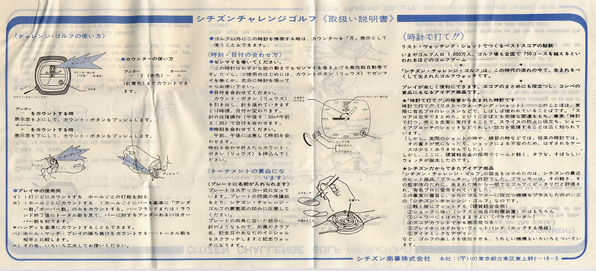 その6-1 チャレンジ・ゴルフの取り説の紹介です!! 本ページに掲載されている技術情報画像は、ガラ研が「シチズン時計 株式会社」様より 許可を頂いて掲載しています。如何なる理由でも、無断転載は、禁止します。 本ページに掲載されている製品資料・カタログ・取扱説明書等の著作権は、 「シチズン時計 株式会社」様にあります。