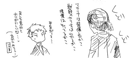 昔、まだ私が高校生とか大学生とかやってた頃は、ゲームも結構やっていたのですが 就職してこの方、時間もないし、すっかりご無沙汰になってました。‥‥がっ まさかまたFF関連で手を出すなんて! ホント、まさかですよ‥‥。ゲームやる時間ないのに‥。 しかしせっかくサイトもあることなのでこっそりプレイ日記などつけてみたいと思います。 こっそりなので、不定期更新で表での更新履歴もありません。思いついた時にラクガキとか ばばっ!とやっつけで書いていきます。新しいものは下へ下へと付け加え〜。 あ、原稿付近になったら更新止まります。ゲームも止まるので(笑) 今までの携帯の機種はBC対応ではなかったので、まず始めるのは携帯を買い換えるところから。 で、どうせならクラウドとおそろにしようというのがファン心理というもの。 ドコモのP900iVの黒色ということをネットで調べて、さっそく近くのドコモショップへ 出かけていきました。この時点ではすぐに携帯を買い換えることが出来ると思ってたんだな、私は。 ‥‥甘かった。なかったんだよ、機種が‥‥。 どうやらもう生産中止になっているらしく、私の行ったショップでは扱っていないとのこと。 なら他のショップは?と尋ねる私に「こちらでは調べられないので取扱店一覧をあげるから 自分で調べてね。ちなみに取り寄せも出来ないから直接そのショップへ行ってね」 ということをもっと丁寧な口調でオブラートで包みながら(しかしキッパリと)言われました‥‥。