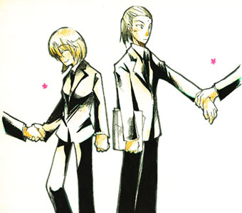 華やかな人達がいっぱいでとっても幸せでした。そんなこんなでオンリー楽しんできました。 楽しみすぎたせいで翌々日から熱だしてぶっ倒れるという醜態をさらしてみたり‥‥。 それともオンリーで疲れていたにも関わらず、バレンタインのチョコ買いに行き、 帰りに勢いでファンク踊ってからジムで30分ほど筋トレとかやったのがいけなかった んだろうか?(←そりゃいかんわ。と同僚には言われた)。 まあ、まだ病み上がりなので今日はぐっすり寝よう。キーラちゃんのレベル上げは また明日からボチボチ始めたいと思います〜。 ‥‥というか次は春コミか。息つく暇なしってカンジだわ。 ![]() 会場で飾ってた絵。キーラとツォンさん。それぞれの手を引いているのは ロッドとヴェルド主任のつもりなのさ〜。 前回書いた時から随分傾向が変わってきたので もう一度整理しなおしてみたいと思います。 だからここはBCプレイ日記じゃないのかと‥‥ま、いいか。 ★ ヴェルド×ツォン ★ 気が付いたらすっかりBCにおける本命カプですよ(笑)。 このあたりから坂を転がり落ちるようにハマっていく 過程がわかる‥‥。でも、やっぱりツォンさんの方が主任に片想いっぽくね。 まだBCが終わってないので、最終的にはどういうところに落ち着くかは未定 ですが、たぶんこの二人は幸せにはならんだろうなぁ‥‥。脳内保管だけでも幸せにしておく べきなのか? ところでヴェルド×ツォンはヴェルツと言うらしいですよ!(←教えてもらった!)。 今までどう略したものかと頭を悩ませてました。新規参入組だから世間に合わせよう と思っていたんだけど、肝心の合わせる世間が見つからなくて‥‥(泣)。 ★ ロッド×キーラ ★ 以前はキーラの片想いだとか書いていたのですが、今は逆にロッドの方がキーラに片想いです。 ノーマルカプではイチオシかしら。この二人の本も出してみたいと思うのですが、 たぶん単品で出すことはないだろうと思うので、タークス女の子本とか出した時に(←予定) 載せることになるんだろうな。いや、予定。あくまでも、予定。 ★ ツォン←キーラ ★ そしてキーラはツォンさんに片想いなのです。彼女はツォンさんが主任一筋だということを まだ知らないので。いや、だってほら。何かかなりのニブチンなような気がしません? まあ、そういうところがキーラの可愛いところだと思うんだけどね(親の欲目‥‥) ★ 二丁×散弾 ★ この二人はアレだ!タークスと言えば片想い、片想いと言えばタークスの、あのタークス メンバーでありながらもフツーに両思いの人たちです。ミラクル!(笑) 二丁が散弾ちゃんに目をつけて、オトしたってカンジかな。なかなかイイカンジの 二人だと思うのですよ。 ★ 刀→ヴェルド(‥を筆頭した他男メンバー) ★ すまん!(笑)いや、ホントごめん刀!! 実はこれを書いている時点でまだ19章まで行ってないので(現在15章〜!) 刀は出てきてもいないんだけど、何かこうオフィシャルの設定と顔を見た途端に私の モエにがっつり来たね!奴は真性だと!! そして奴の本命はヴェルド主任だと!!ツォンさんライバル登場だよ〜‥‥と、思いきや 刀はツォンさんのこともそれなりに狙っていたりして‥‥。まあ詳しくは追々書いていきますわ。