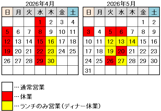 2026.04.18更新 - - - - - - - - - - - - - - - - - - - - - - - - - - - - - - - - - - - - - - - - - - 〜 営業時間のお知らせ 〜 いつもご来店いただきありがとうございます。 当面の間、営業時間を下記の通りとさせていただきます。 【日〜金曜日】 ランチ営業…11:30〜14:30(L.O 13:45) ディナー営業…18:00〜21:00(L.O 19:30) 【土曜日】 ランチ営業…11:30〜14:30(L.O 13:45) ディナー営業…18:00〜21:30(L.O 20:00) ★平日ディナーにつきましては、ご予約状況に応じて 閉店時間より前に閉めてしまう場合がございます。 ご了承ください。 お客様には大変ご迷惑をお掛けしますが 新型コロナウイルスの感染拡大・防止に努めていく為 ご理解くださいますよう、何卒お願い申し上げます。 皆様のご来店お待ちしております。 - - - - - - - - - - - - - - - - - - - - - - - - - - - - - - - - - - - - - - - - - - 〜 5月の営業について 〜 5月の営業カレンダーは下記の通りとなります。 よろしくお願い致します。