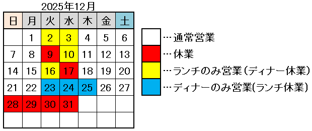 2025.12.14更新 - - - - - - - - - - - - - - - - - - - - - - - - - - - - - - - - - - - - - - - - - - 〜 営業時間のお知らせ 〜 いつもご来店いただきありがとうございます。 当面の間、営業時間を下記の通りとさせていただきます。 【日〜金曜日】 ランチ営業…11:30〜14:30(L.O 13:45) ディナー営業…18:00〜21:00(L.O 19:30) 【土曜日】 ランチ営業…11:30〜14:30(L.O 13:45) ディナー営業…18:00〜21:30(L.O 20:00) ★平日ディナーにつきましては、ご予約状況に応じて 閉店時間より前に閉めてしまう場合がございます。 ご了承ください。 お客様には大変ご迷惑をお掛けしますが 新型コロナウイルスの感染拡大・防止に努めていく為 ご理解くださいますよう、何卒お願い申し上げます。 皆様のご来店お待ちしております。 - - - - - - - - - - - - - - - - - - - - - - - - - - - - - - - - - - - - - - - - - - 〜 12月の営業について 〜 12月の営業カレンダーは下記の通りとなります。 よろしくお願い致します。