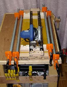 ※ ベニヤ合板等の板材切断用にワークベンチへ乗せて使う電動丸鋸冶具を製作しました。 丸鋸のモーター部がL形アングルに当たって、厚さ35mmまでしか切断できない。(^。^;) なお、丸鋸を外せばポニークランプ受け台として兼用できます。![]()