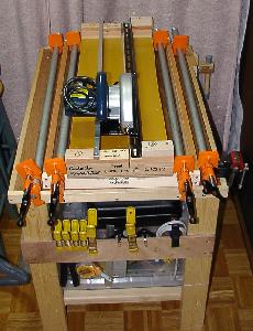 ※ 2x4材も切断できるように改造し長さ81mm、厚さ50mmまで切断できるようになりました。(^。^;) なお、ポニークランプが置けなくなったので、専用の受け台を製作しました。