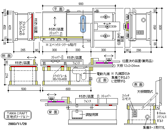 ※ この度 TAMA CRAFT(前作の芝地式"もどき"から進歩した?)"らしき"テーブルソーを製作しました。(^。^;) 矢っ張り、左側にスライドテーブルがあった方が作業を安全に行えるような気がする。![]()