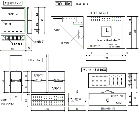 ※ トリマーやドリルの先端部品(ビット)を整理して収納する箱を室内用と屋外用それぞれ製作した。