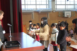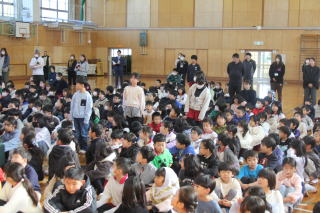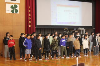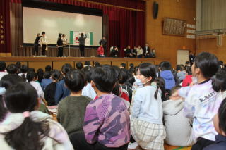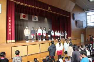 | 1月8日木曜日 書初め大会&北海道士別市小学校派遣団との交流 今日は、年に一度の書初め大会です。これまでの練習の成果を発揮する日です。朝から準備をして、1時間目から全校一斉にスタート。みんな心を落ち着かせて、静かに取り組んでいました。 そして、さらに今日は、遠く北海道士別市からお客さんが来ました。3年生がみよし市の紹介し、4年生が全国の名所や特産物、北海道のよさこいソーランを披露しました。また、5年生は「この星に生まれて」の学年合唱、6年生は「Paradise Has No Border」を披露しました。 士別市派遣団は、そのお礼として士別市や北海道の紹介をしてくれました。そして、三好丘小学校のみんなに北海道士別市の「雪とつらら」をプレゼントしていただきました。最後は、みよし市の給食を一緒に食べて、楽しく一日を過ごすことができました。士別市のみなさま、ありがとうございました。 |
