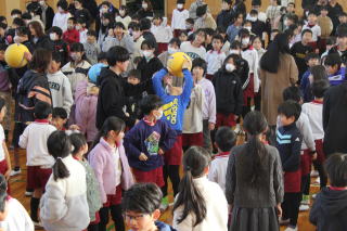 | 1月14日水曜日 ふれあいコミュトレ 今日の朝は、全校でのふれあいコミュトレ。いつもは、クラスで行うコミュトレを今回は、全校児童が体育館に集まり、実施しました。内容は「認め合いボール渡し名前シャワー」です。ボールを渡す際に、名前を呼びながら「~~が好きな〇〇さん」など、その人が好きなものを付け加えて、相手にボールを渡します。受け取った人は、笑顔で「ありがとう!」と伝えて、次の相手に渡していくというレクリエーションです。先生も列の一員となって、みんなで楽しむことができました。 |