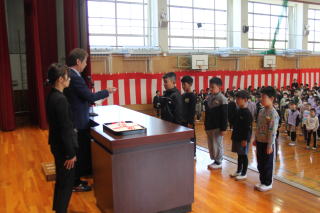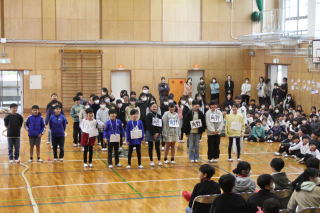 | 3月2日月曜日 登下校の見守りに感謝する会 昨年から始まった「登下校の見守りに感謝する会」。昨年は、あいにくの雨で、室内での開催でしたが、今年は晴天で、運動場で実施することができました。毎日、登下校を見守っている地域のボランティアの方々のおかげで、子どもたちが安心して登下校をすることができています。地域の皆様に感謝です。 |