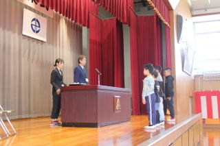 | 3月24日火曜日 修了式 今日は、修了式。1~5年生が、修了証をいただく日です。各学年の代表者が壇上で受け取り、代表者に続いて各学年の子たちも一緒に、修了認定を受けました。校長先生の話の後、1・3・5年生の代表児童が、1年の振り返りを発表しました。どの子も素晴らしい発表でした。そして、校歌を合唱した後は、春休みの過ごし方について、生徒指導の先生からお話がありました。来年度につながる修了式となりました。 |