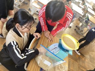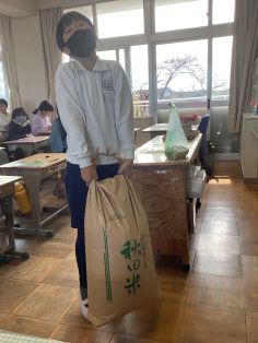 | 米収穫 5年生は、収穫したお米を自分で測り、持ち帰る準備をしました。一人分の2キロは思っていた以上に多く、その重さに児童は驚いていました。今年も大変豊作でした。米作り体験へのたくさんのご協力、ありがとうございました。 |