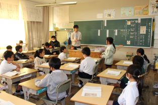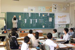 | 授業研究 6年4組で、外国語の授業研究が行われました。ペアで日常会話に親しんだり、グループで身の回りのものとその生産国についてのクイズを出し合ったりしました。学んだ表現を生かして、積極的に話そうとする姿が見られました。 2年1組では、教育実習生による道徳の授業が行われました。みんなが気持ちよく生活するために大切なことを考えました。 |