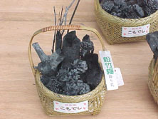 ![]() 各種の炭です。これは飾り炭ですち。 竹、松坊栗などのいろんな物がを炭にしています。 竹炭のページをご覧ください。 |