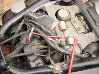 (電球を使って、片方をバッテリー+端子に、片方を上の写真の赤線(または黒線)に接続する方法もある。この場合、ポイントが閉じている間は電球が点灯し、ポイントが開いている間は消灯する)