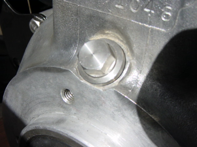 クランクケースのタイミングプラグから合マーク(T)の位置を見ます。規定値は上死点前5度で、合マークがタイミングホールの中央にくる位置です。