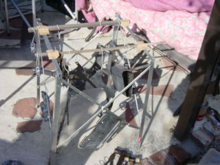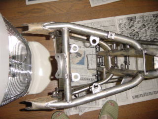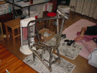 朝9時ごろ剥離剤を塗り始め、スクレーパで大雑把に塗装を剥がす。続いてワイヤブラシで擦り、大まかに塗装を取る。そして最終仕上げとして、電ドルによる真鍮ブラシで擦っていきます。この間、実質約5時間くらいかかり、この時点で疲れ果ててしまう。そして助手1号を迎えに行き、夕ご飯の準備を済ませ、フレームと一緒に風呂に入り、剥離剤、油分を落としていきます。そして入浴後、遠赤外線ヒーターで水分を蒸発させます。