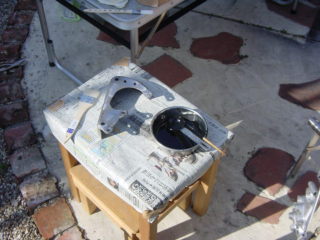 そこから電ドルに真鍮ブラシを付けて、錆びと塗装を落としていきます。パーツクリーナーで剥離剤を落とそうとしたところ、スプレー缶がすぐに空になってしまったため、フィガロさんとホームセンターに買出しに行く。ブラシでこすったあとからすぐに錆びがでてくるので、POR−15を二人で分担しながら塗り進めていく。