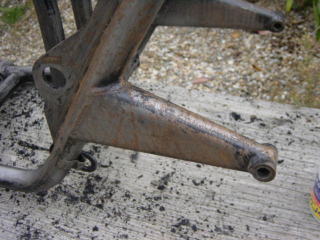 左スイングアームブラケット部ですが、結構錆びがひどいですな。