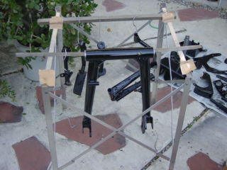 昨日、塗り残した部品を同様の方法で塗っていきます。スイングアーム、左右ステップ、サイドスタンド、センタースタンドです。
