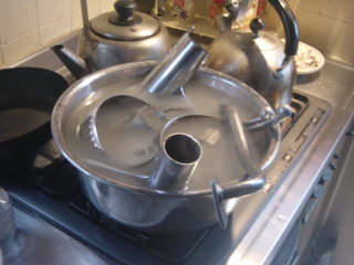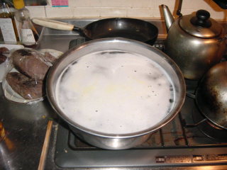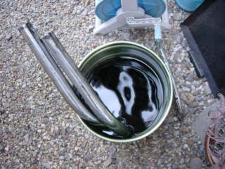 煮こんでいるとカミサンが夕食の支度を始めるとのことで台所を明け渡し、この煮汁をマフラーに入れました。ガムテープでふさいだだけだったので、すぐに漏れ始めてしまい、あえなくマフラー内部のカーボン落しには失敗しました。